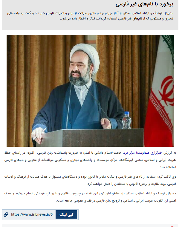 مدیرکل فرهنگ و ارشاد اسلامی استان یزد: به واحد‌های تجاری و مسکونی که از نام‌های غیر فارسی استفاده کرده‌اند، تذکر و اخطار داده می‌شود