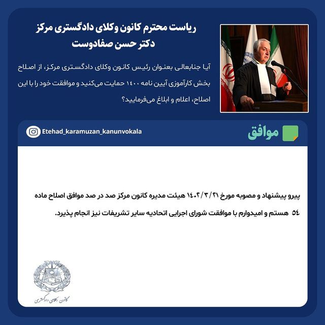 ضمن تشکر از ریاست محترم قوه قضائیه در خصوص اصلاح مواد ناقض استقلال کانون وکلا با هر گونه اقدامی که در جهت مساعدت به کاراموزان محترم وکالت باشد که از جمله آن اصلاح ماده ۵۴ ایین نامه ۱۴۰۰ میباشد آنهم ضمن لحاظ قراردادن آموزشهای لازمه و نیز اخذ ازمون اختبار در راستای تقویت بار علمی عزیزان کاراموز با حفظ استقلال کانون موافقت و تا حصول ،نتیجه پیگیری و همراهی خواهم کرد.