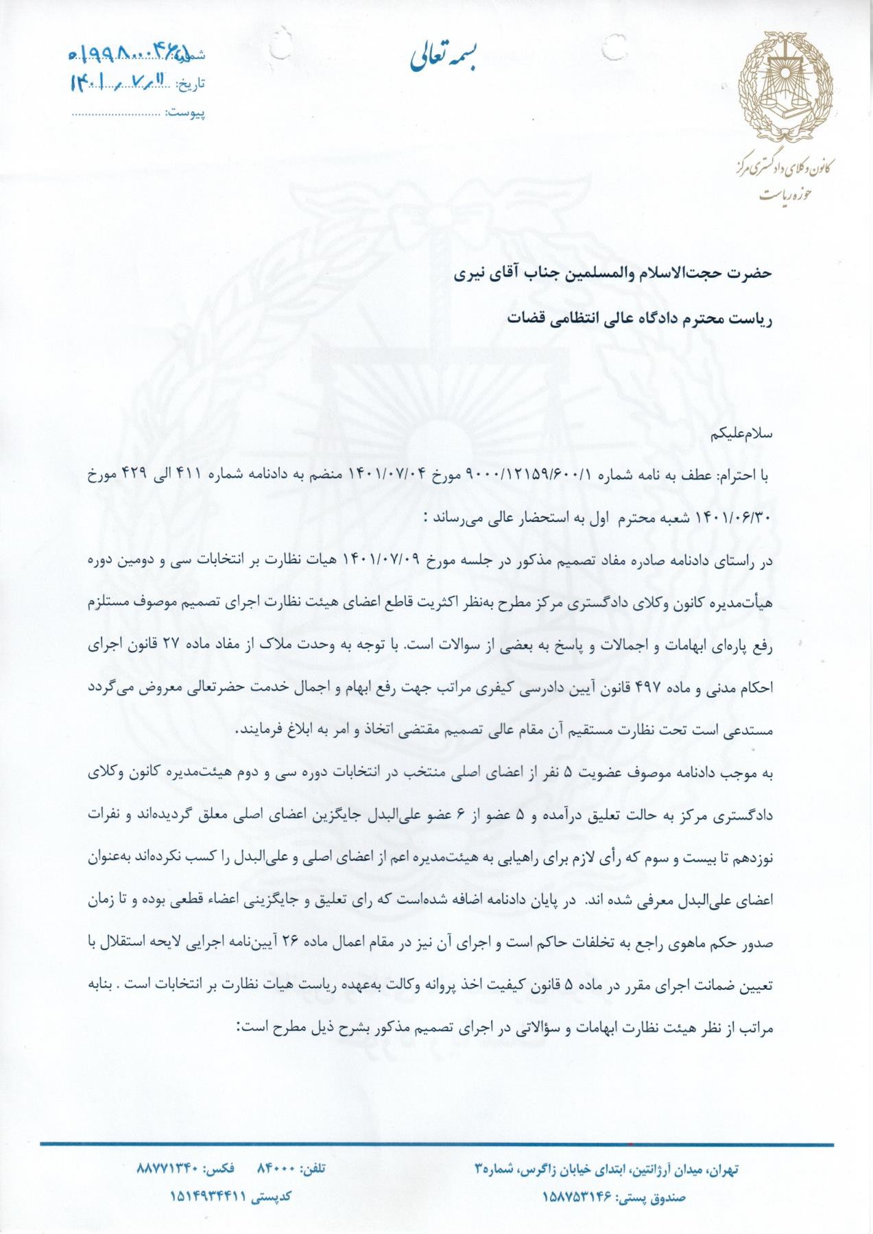 نامه رئیس کانون وکلای مرکز