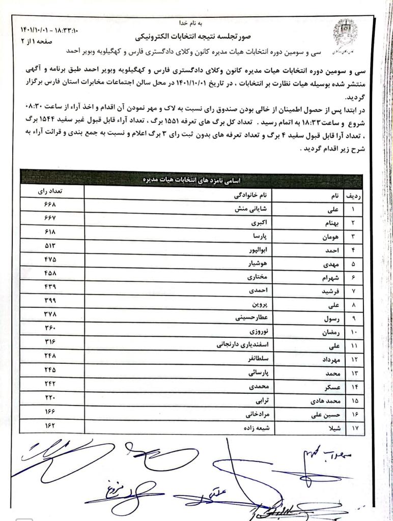 سی و سومین دوره انتخابات هیات مدیره کانون وکلای دادگستری فارس و کهگیلویه وبویر احمد طبق برنامه و آگهی منتشر شده بوسیله هیات نظارت بر انتخابات . در تاریخ ۱۴۰۱/۱۰/۰۱ در محل سالن اجتماعات مخابرات استان فارس برگزار گردید . در ابتدا پس از حصول اطمینان از خالی بودن صندوق رای نسبت به لاک و مهر نمودن آن اقدام و اخذ آراء از ساعت ۰۸:۳۰ شروع و ساعت ۱۸:۳۳ به اتمام رسید . تعداد کل برگ های تعرفه ۱۵۵۱ برگ ، تعداد آراء قابل قبول غیر سفید ۱۵۴۴ برگ ، تعداد آرا قابل قبول سفید ۴ برگ و تعداد تعرفه های بدون ثبت رای ۳ برگ اعلام و نسبت به جمع بندی و قرائت آراء به شرح زیر اقدام گردید.