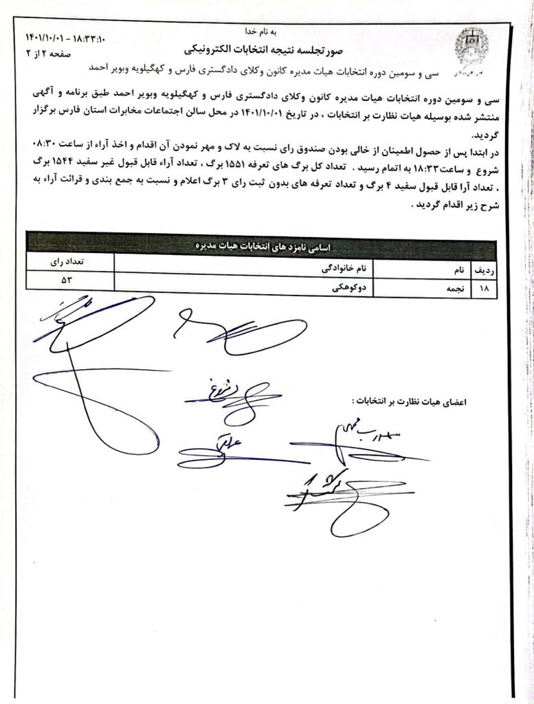 صورتجلسه نتیجه انتخابات الکترونیکی سی و سومین دوره انتخابات هیات مدیره کانون وکلای دادگستری فارس و کهگیلویه وبویر احمد