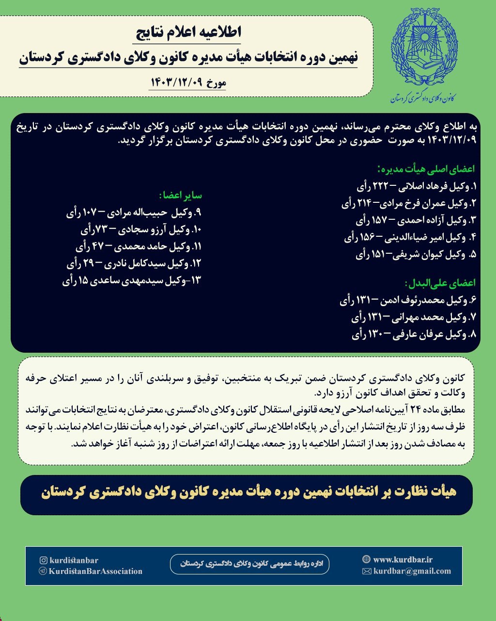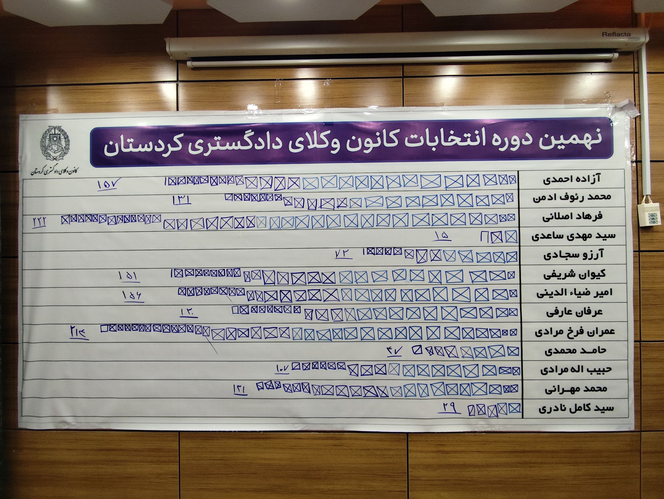 نتایج شمارش آرای انتخابات نهمین دوره هیئت مدیره کانون وکلای دادگستری کردستان