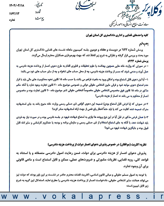 پرسش شماره ۶۳۳ در دویست و هفتاد و دومین جلسه کمیسیون ماهانه نشستهای قضایی دادگستری کل استان تهران مورد بحث و بررسی قرار گرفته و نظراتی به شرح زیر اتخاذ شد که جهت بهره برداری همکاران محترم ارسال می گردد.