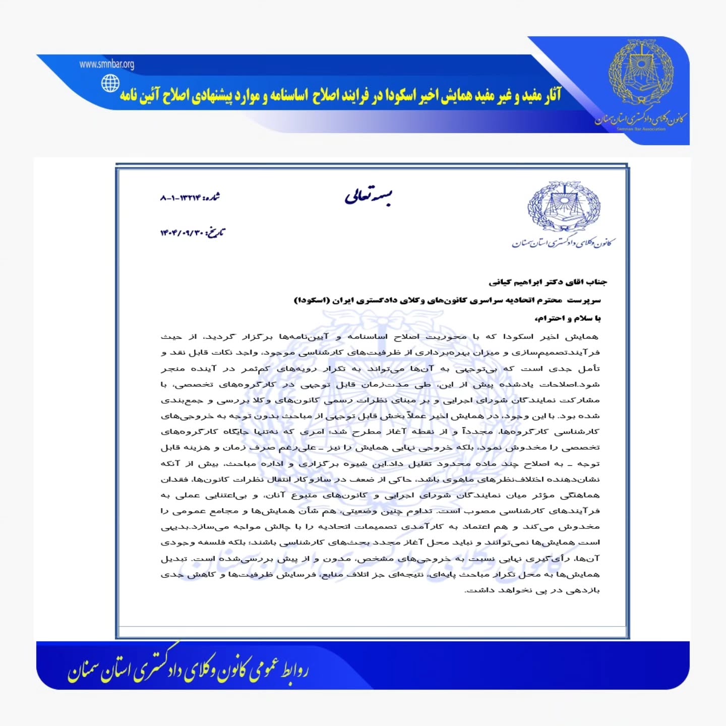 سرپرست محترم اتحادیه سراسری کانونهای وکلای دادگستری ایران (اسکودا)