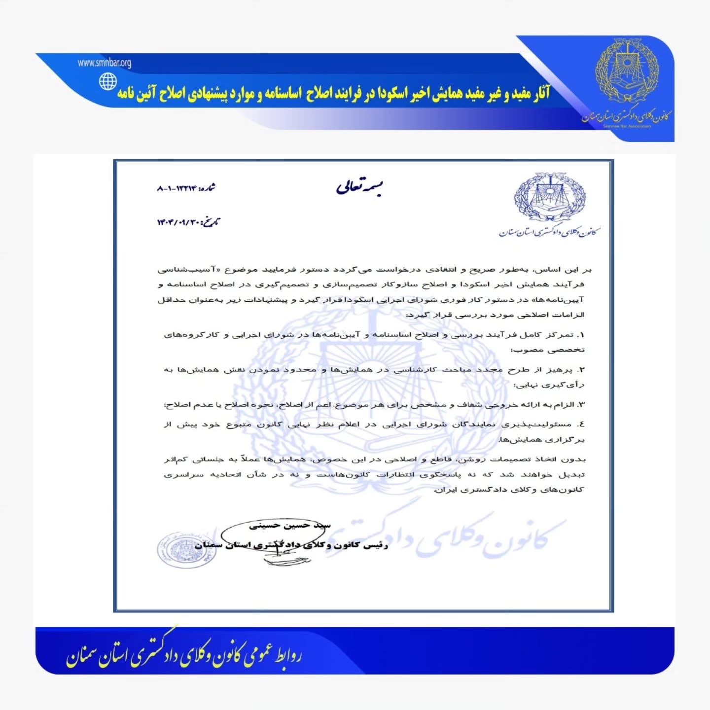 بر این اساس به طور صریح و انتقادی درخواست میگردد دستور فرمایید موضوع «آسیب شناسی فرآیند همایش اخیر اسکودا و اصلاح ساز و کار تصمیم سازی و تصمیم گیری در اصلاح اساسنامه و آیین نامه ها» در دستور کار فوری شورای اجرایی اسکودا قرار گیرد و پیشنهادات زیر به عنوان حداقل الزامات اصلاحی مورد بررسی قرار گیرد.