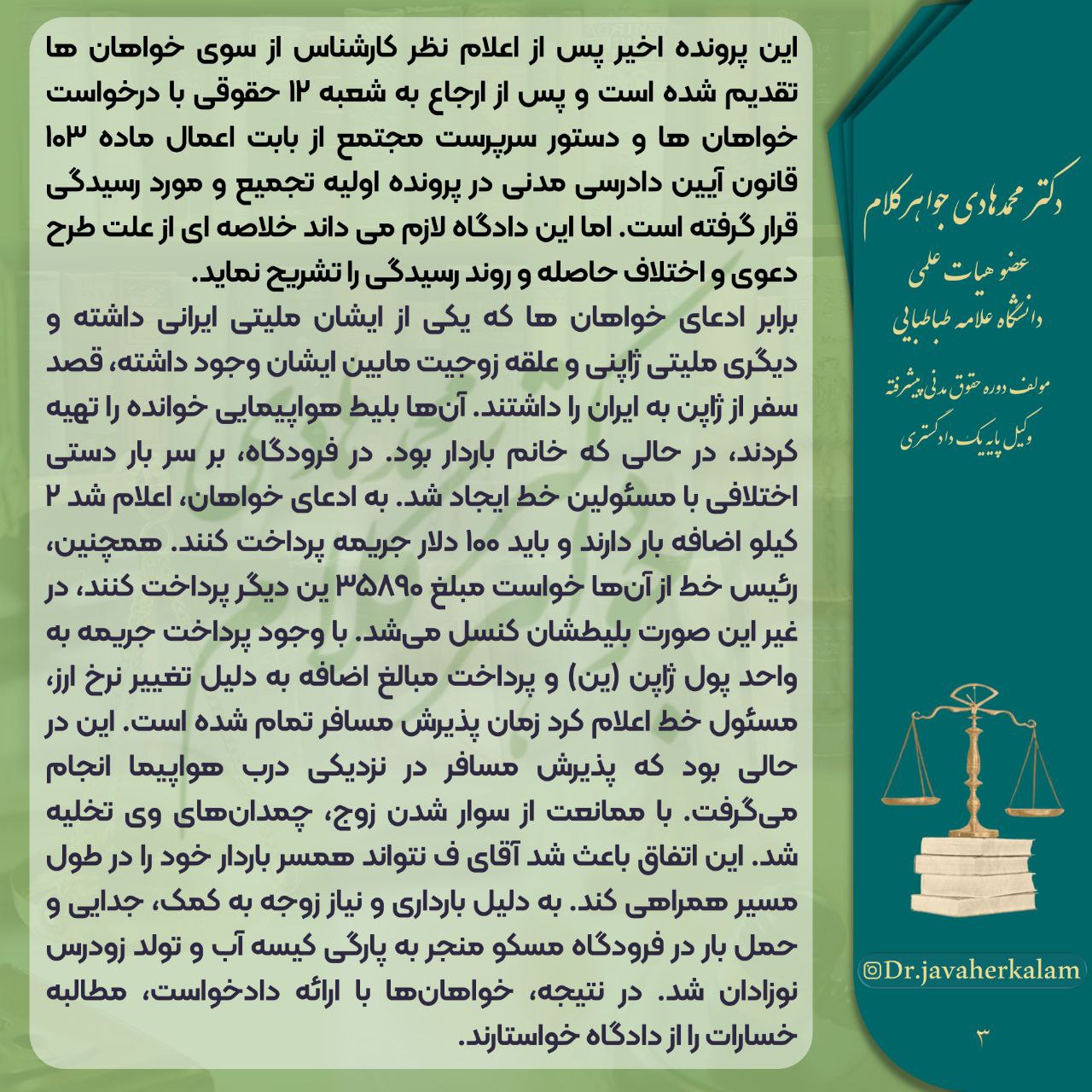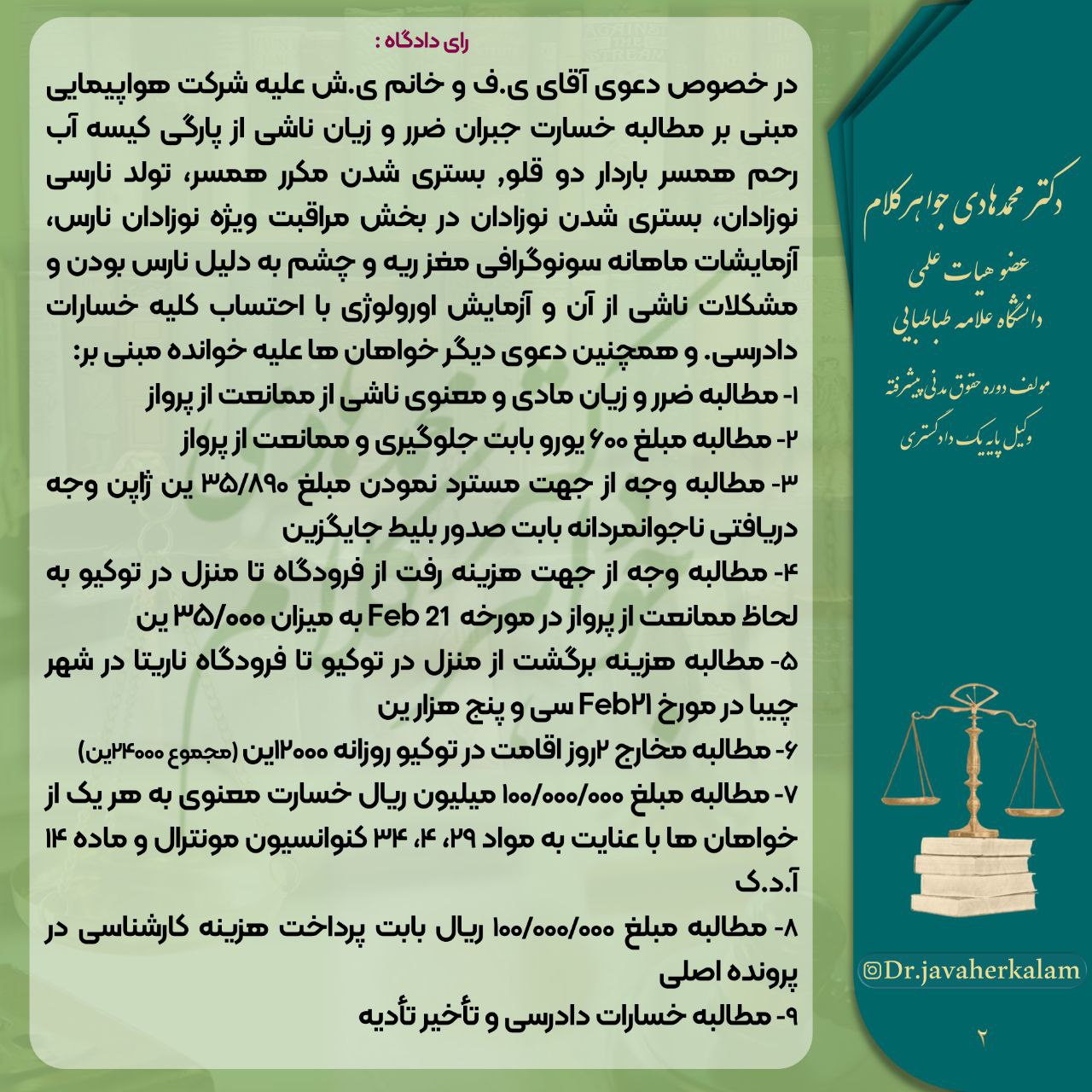 ثالثاً اگر هم قانون این کشور حاکم نمیگردید و قانون ایران حاکم بود و به لحاظ اینکه خوانده روسی بوده و در نظام حقوقی روسیه این نحوه جبران خسارت مورد پذیرش قرار دارد به حکم قاعده فقهی الزام (الزموهم بما ألزموا أنفسهم) امکان جبران خسارت به این طریق قابل پذیرش میگردند. نظر به مبانی مذکور مستنداً به مواد ۹۸۶ قانون مدنی مواد ۲۹ و (۴) ۳۳ کنوانسیون مونترال حکم بر محکومیت خوانده به ۱۰۰/۰۰۰/۰۰۰ ریال به هر یک از خواهانها جمعاً ۲۰۰/۰۰۰/۰۰۰ ریال محکوم مینماید. در خصوص مطالبه خسارت تأخیر تأدیه مطالبه شده با توجه به اینکه قانون در این پرونده به لحاظ حکومت قانون ژاپن، امری موضوعی بوده که باید از سوی خواهان ارائه میگردید و خواهان اقدامی در ارائه قانون در این خصوص از نظام حقوقی ژاپن ننموده است، و بدون ارائه قانون امکان ارزیابی آن برای دادگاه نبوده مستنداً به ماده ۲ قانون آ.د.م قرار عدم استماع دعوی در این خصوص صادر میشود. در خصوص مطالبه خسارات دادرسی پرونده کلاسه ۰۱۰۰۱۳۸ این دادگاه مستنداً به مواد ۵۱۵ و ۵۱۵ قانون آ.د.م حکم بر محکومیت خوانده به پرداخت ۹۶۸/۹۱۴/۴۶۱ ریال صادر مینماید که چون خواهان اعسار از پرداخت هزینه دادرسی داده و پذیرفته است مستندا به ماده ۵۱۱ قانون آ.د.م در زمان اجرای حکم از کل محکوم به کسر و به حساب دادگستری واریز میگردد. همچنین دادگاه خوانده را محکوم به پرداخت مبلغ ۱۰۰ میلیون ریال بابت هزینه کارشناسی مینماید. رای صادره حضوری و ظرف ۲۰ روز پس از ابلاغ قابل تجدیدنظرخواهی در محاکم تجدیدنظر استان تهران است.