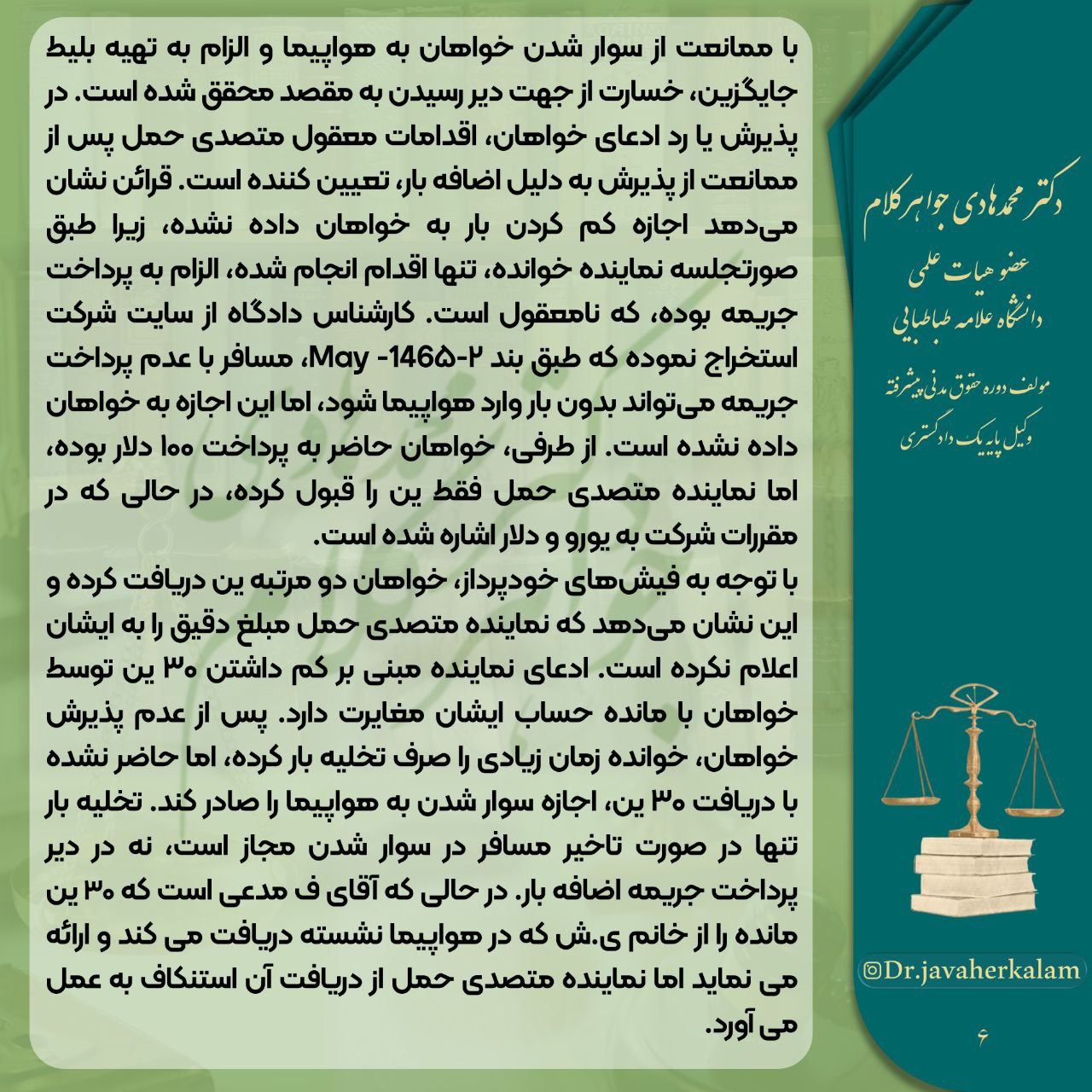 با ممانعت از سوار شدن خواهان به هواپیما و الزام به تهیه بلیط جایگزین، خسارت از جهت دیر رسیدن به مقصد محقق شده است. در پذیرش یا رد ادعای خواهان، اقدامات معقول متصدی حمل پس از ممانعت از پذیرش به دلیل اضافه بار، تعیین کننده است. قرائن نشان میدهد اجازه کم کردن بار به خواهان داده نشده، زیرا طبق صورتجلسه نماینده خوانده، تنها اقدام انجام شده، الزام به پرداخت جریمه بوده، که نامعقول است. کارشناس دادگاه از سایت شرکت استخراج نموده که طبق بند ۲-۱۴۶ May مسافر با عدم پرداخت جریمه میتواند بدون بار وارد هواپیما شود، اما این اجازه به خواهان داده نشده است. از طرفی، خواهان حاضر به پرداخت ۱۰۰ دلار بوده، اما نماینده متصدی حمل فقط ین را قبول کرده، در حالی که در مقررات شرکت به یورو و دلار اشاره شده است.