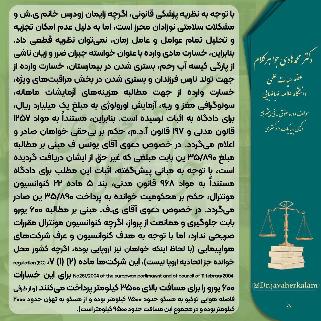 در خصوص دعوی آقای ی.ف و خانم ی.ش علیه شرکت هواپیمایی مبنی بر مطالبه خسارت جبران ضرر و زیان ناشی از پارگی کیسه آب رحم همسر باردار دو قلو، بستری شدن مکرر همسر، تولد نارسی نوزادان، بستری شدن نوزادان در بخش مراقبت ویژه نوزادان نارس، آزمایشات ماهانه سونوگرافی مغز ریه و چشم به دلیل نارس بودن و مشکلات ناشی از آن و آزمایش اورولوژی با احتساب کلیه خسارات دادرسی، و همچنین دعوی دیگر خواهانها علیه خوانده مبنی بر: