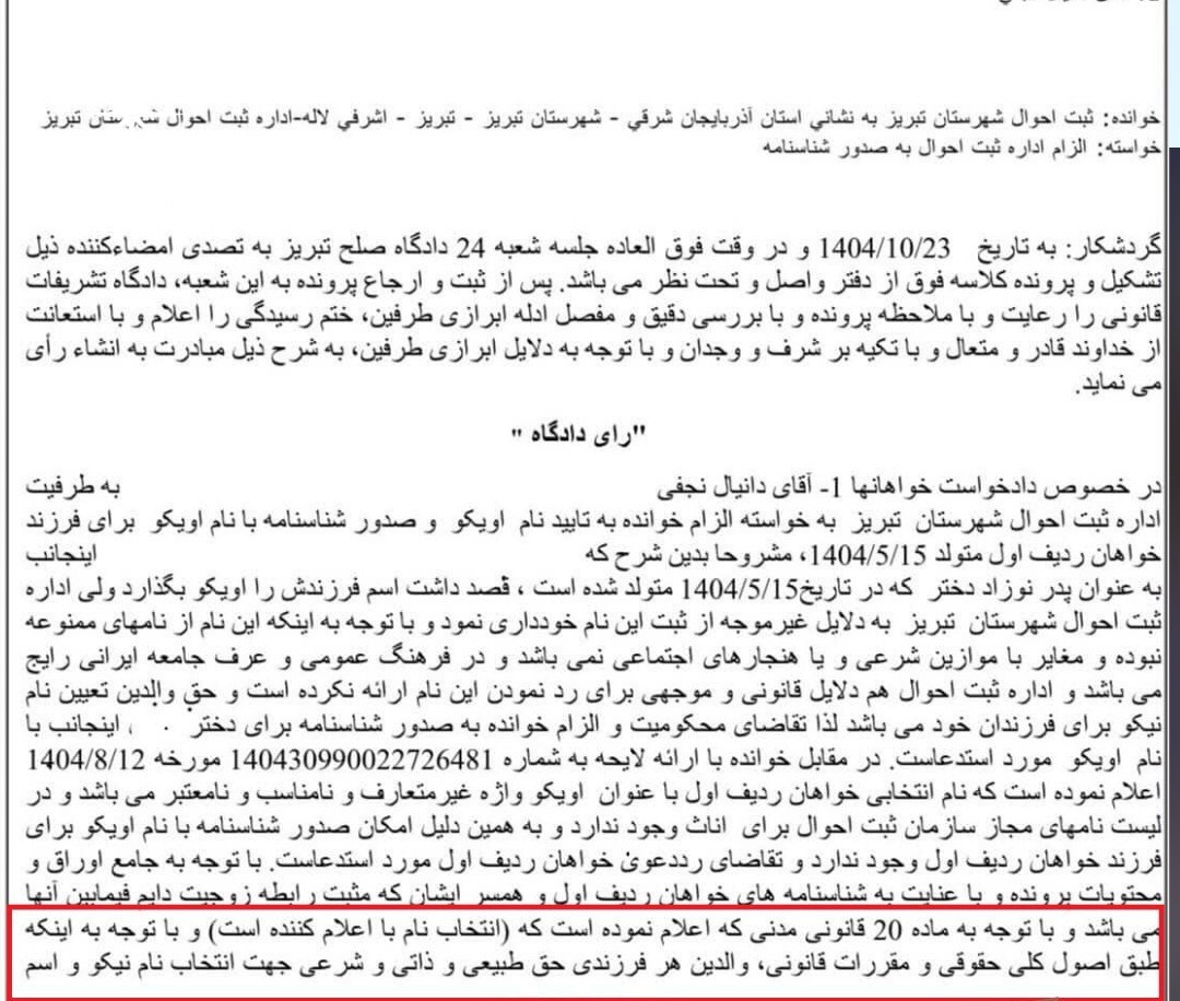 در خصوص دادخواست خواهانها ۱- آقای دانیال … به طرفیت اداره ثبت احوال شهرستان تبریز به خواسته الزام خوانده به تایید نام اویکو و صدور شناسنامه با نام اویکو برای فرزند خواهان ردیف اول متولد ۱۴۰۴/۵/۱۵، مشروحا بدین شرح که اینجانب به عنوان پدر نوزاد دختر که در تاریخ ۱۴۰۴/۵/۱۵ متولد شده است، قصد داشت اسم فرزندش را اویکو بگذارد ولی اداره ثبت احوال شهرستان تبریز به دلایل غیر موجه از ثبت این نام خودداری نمود و با توجه به اینکه این نام از نامهای ممنوعه نبوده و مغایر با موازین شرعی و یا هنجارهای اجتماعی نمیباشد و در فرهنگ عمومی و عرف جامعه ایرانی رایج میباشد و اداره ثبت احوال هم دلایل قانونی و موجهی برای رد نمودن این نام ارائه نکرده است و حق والدین تعیین نام نیکو برای فرزندان خود میباشد لذا تقاضای محکومیت و الزام خوانده به صدور شناسنامه برای دختر اینجانب با نام اویکو مورد استدعاست.