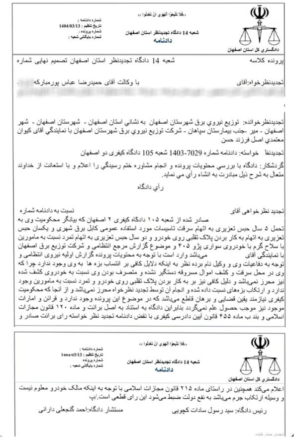 تجدید نظر خواهی آقای … نسبت به دادنامه شماره…. صادر شده از شعبه ۱۰۵ دادگاه کیفری ۲ اصفهان که بیانگر محکومیت وی به تحمل ۵ سال حبس تعزیری به اتهام سرقت تاسیسات مورد استفاده عمومی کابل برق شهری و یکسان حبس تعزیری به اتهام به کار بردن پلاک تقلبی روی خودرو و دو سال حبس تعزیری به اتهام تمرد نسبت به مامورین با سلاح گرم با خودروی سواری پژو ۴۰۵ و موضوع گزارش مرجع انتظامی و شرکت توزیع برق اصفهان با نمایندگی آقای…..می باشد وارد است.