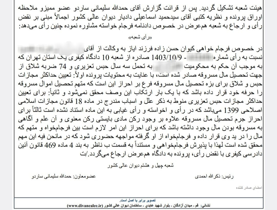 تاریخ وصول دادخواست فرجامی: ۱۴۰۳/۱۰/۱۰