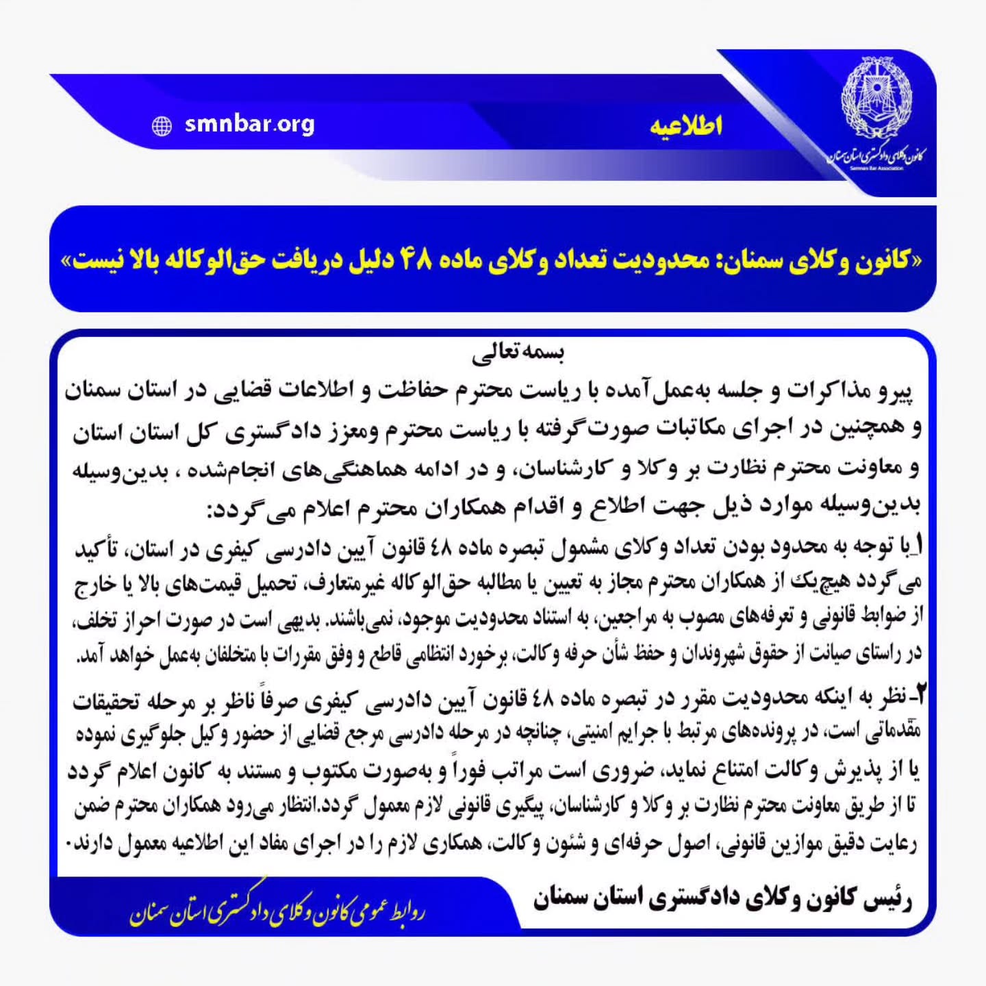 - درخواست رئیس کانون وکلای دادگستری سمنان برای جلوگیری از رویه های سلیقه ای در اعمال تبصره ماده ۴۸ قانون آیین دادرسی کیفری