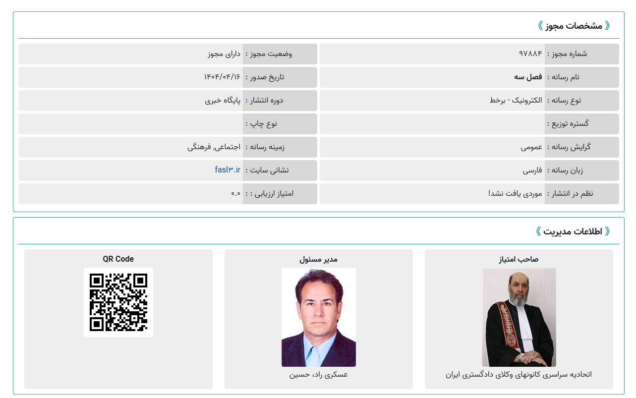 بررسی سایت جامع رسامه های کشور نشان میدهد، پایگاه خبری فصل سه با دامنه «fasl3.ir» با صاحب امتیازی اتحادیه سراسری کانون های وکلای دادگستری ایران (اسکودا)، به عنوان پایگاه خبری کانونهای وکلای دادگستری، اختصاص یافته است.