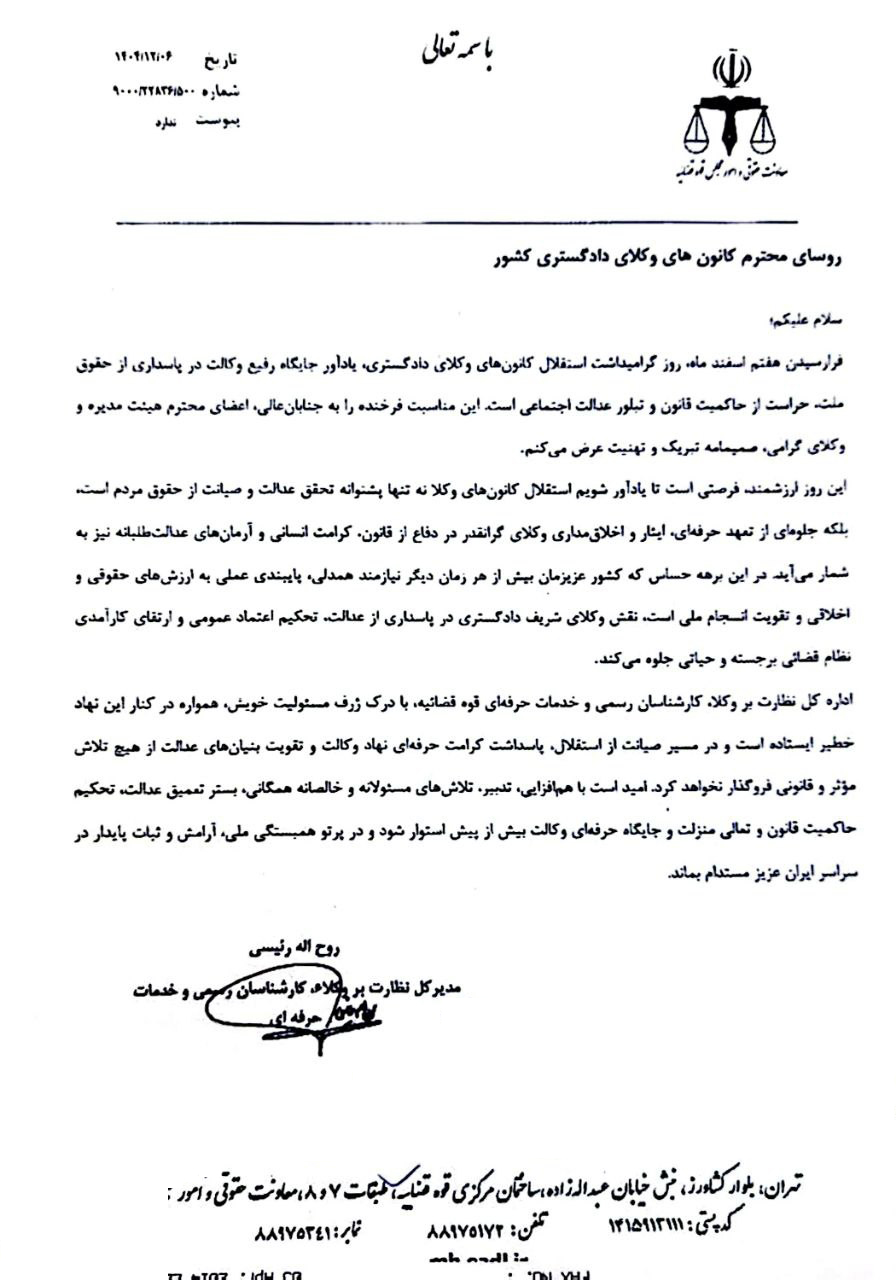 وکلاپرس- مدیرکل نظارت بر وکلا، کارشناسان رسمی و خدمات حرفهای معاونت حقوقی و امور مجلس قوه قضائیه در نامه ای به روسای کانون های وکلای دادگستری سراسر کشور، هفتاد و سومین سالروز استقلال کانون وکلای دادگستری را تبریک گفت.