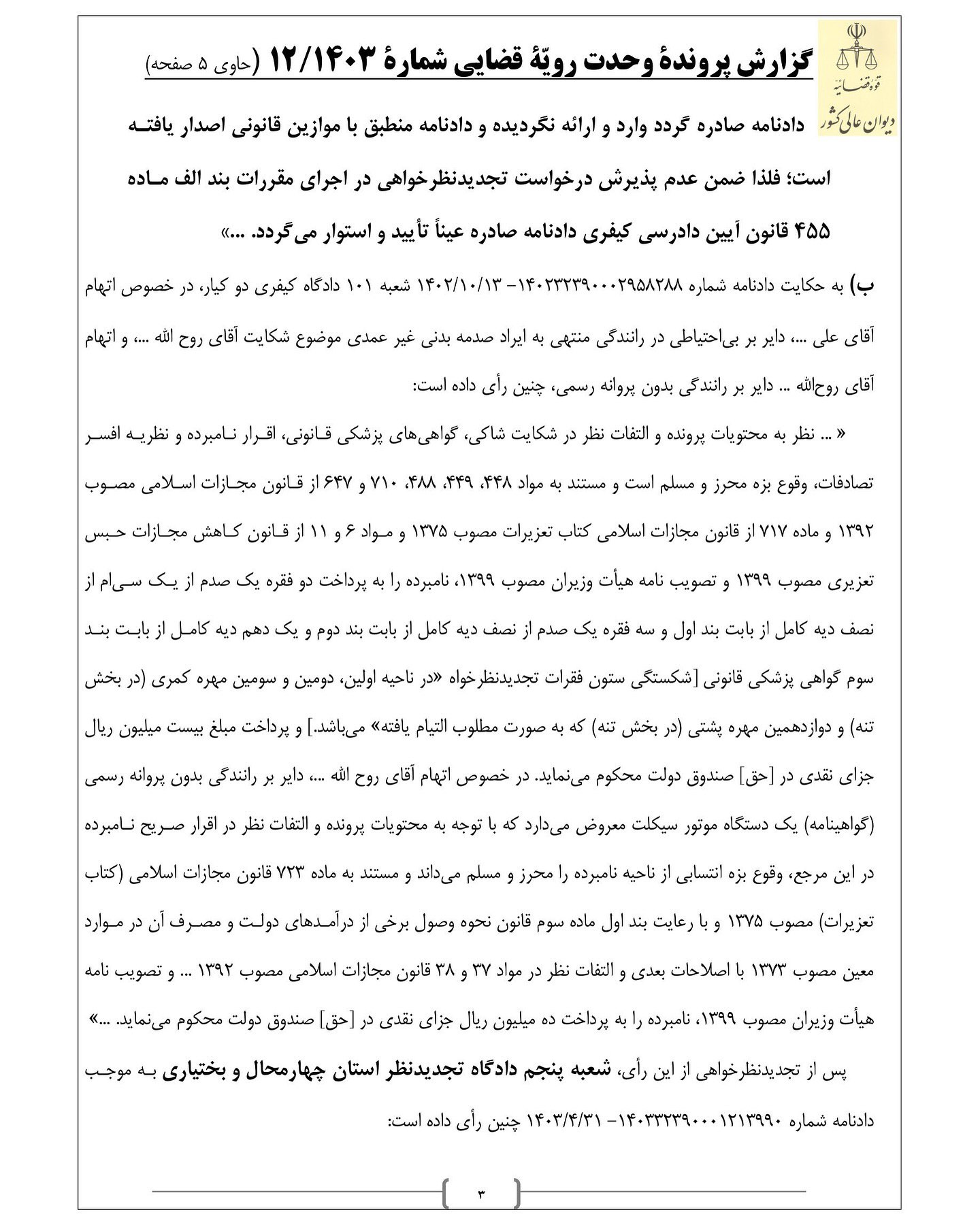 پس از تجدیدنظر خواهی از این رأی شعبه پنجم دادگاه تجدید نظر استان چهارمحال و بختیاری به موجب دادنامه شماره ۱۴۰۳۳۲۲۹۰۰۰۱۲۱۳۹۹۰-۱۴۰۳/۴/۳۱ چنین رأی داده است: