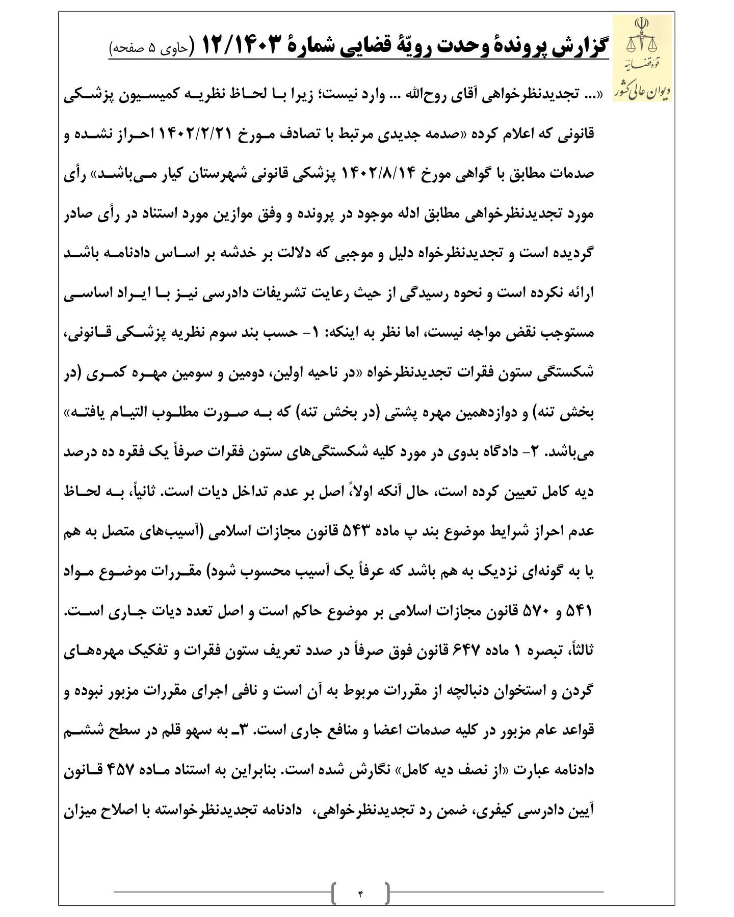 ۱- حسب بند سوم نظریه پزشکی قانونی شکستگی ستون فقرات تجدید نظرخواه در ناحیه اولین دومین و سومین مهره کمری (در بخش تنه)و دوازدهمین مهره پشتی (در بخش تنه) که به صورت مطلوب التیام یافته میباشد.