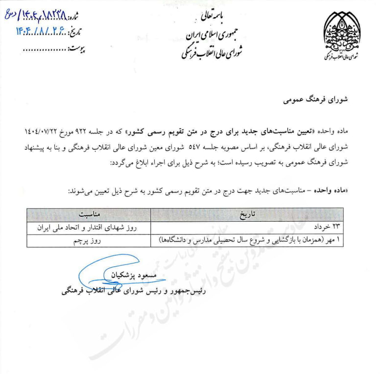 ماده واحده تعیین مناسبتهای جدید برای درج در متن تقویم رسمی کشور که در جلسه ۹۲۲ مورخ ۱۴۰۴/۰۷/۲۲ شورای عالی انقلاب فرهنگی بر اساس مصوبه جلسه ۵۴۷ شورای معین شورای عالی انقلاب فرهنگی و بنا به پیشنهاد شورای فرهنگ عمومی به تصویب رسیده است؛ به شرح ذیل برای اجراء ابلاغ می گردد: